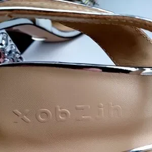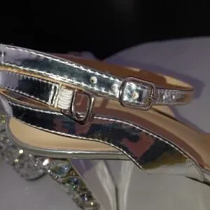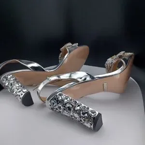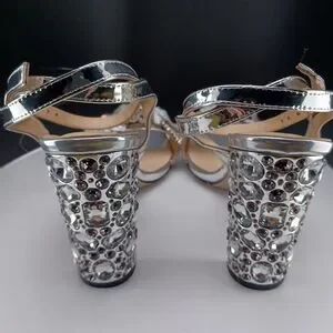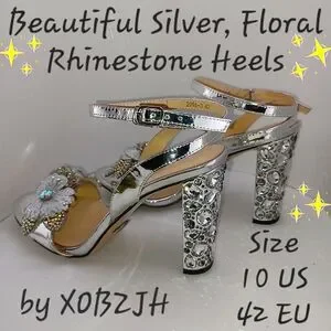 Silver Metallic with floral & leaves design in front & semi Chunky style heel decorated with Rhinestones.