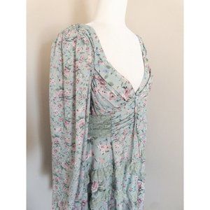 floral mini dress, open back dress, tiered ruffle hem, spring outfit, long sleeve dress, ruched bust, Altar'd State dress, Aderny style, boho chic dress, mint green dress, feminine outfit, party dress for women, lightweight fabric dress