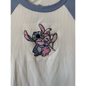 Disney Lilo & Stitch Cream Pink Blue Hearts Embroidered Stitch Angel Crew Neck Raglan Short Sleeve Girls’ Ribbed T Shirt Top Size M 10/12 Medium 10/12