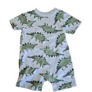 These rompers feature delightful dinosaur designs, with a green set showcasing a playful dinosaur graphic and a blue set adorned with an all-over dinosaur pattern. Crafted from soft, lightweight material, they ensure comfort for a full day of play.