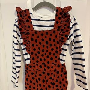 This delightful jumpsuit by Hanna Andersson features charming ruffled shoulders, combining elegance with a playful touch. The black and brown color scheme offers a sophisticated yet fun look, mixed media style with striped long sleeve shirt underneath. Super soft corduroy with elastic back for comfort. Two buttons in the back for adjustable straps. Jumper and shirt both size 110 cm/ 5 us. Washed and never worn. Excellent condition!