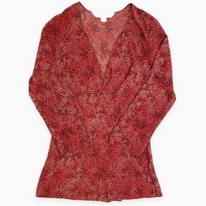 This ultra lightweight swim coverup features a keyhole V-neck and long sleeves. It has a sheer polyester fabric and a snakeskin pattern. Red/burgundy color. Size XS.