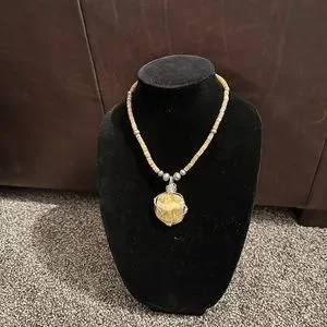 Hand Crafted “One of a Kind” by Unique Earth. It is Yelliw/Gold Quartz, Shell & Sterling Silver. It has Handmade Native American Sterling Silver Flower Beads & Clasp. The Quartz is wrapped in Sterling Silver Wire. It is approximately 17.5” in length and the pendant is approximately 2.5” in length. Offers are welcome!