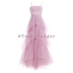 Showstopping tulle gown with a fitted bodice and spaghetti straps. Dreamy tiered ruffles cascade down the skirt creating a flattering A-line shape. Crafted from tulle for a romantic look for your next special occasion