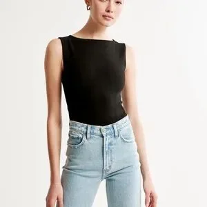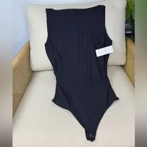 This sleek black bodysuit features a sleeveless design and a fitted silhouette, perfect for a streamlined look. Its smooth, stretchy fabric ensures comfort and style, making it an ideal choice for layering or wearing on its own.
