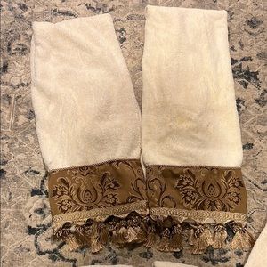 Luxurious 6 piece set of cream towels with intricate brown tassel detailing. Perfect for adding a touch of elegance to any bathroom. They were used in my bathroom. They are in good conditions but there might be little spots of usage and discolor in some areas. When hung up, you can’t see anything on them.