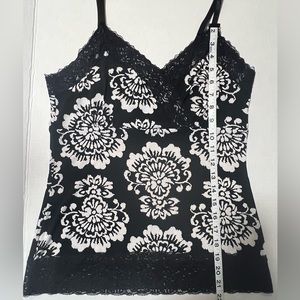 Elegant black and white camisole with floral patterns and lace trim. Perfect for a chic and stylish look. Excellent condition