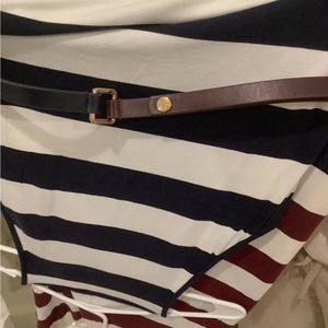 Elegant sleeveless dress with bold navy, white, and maroon stripes. Ideal for casual outings.