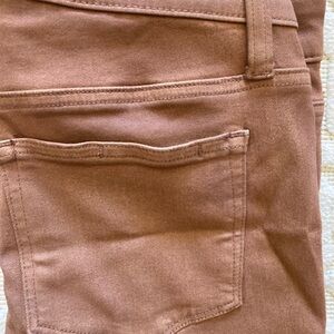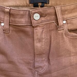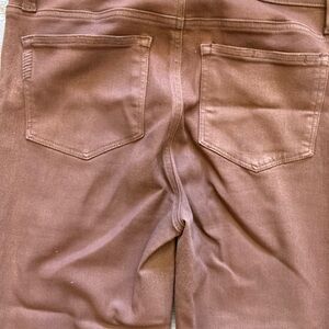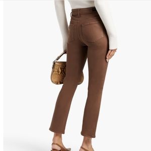 These PAIGE jeans feature a rich brown hue and a chic ankle-length cut, perfect for showcasing your favorite footwear. Crafted from smooth denim, they offer a tailored fit that contours to your shape, providing both style and comfort.