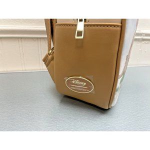 The Hundred Acre Wood gang is rolling deep on this mini backpack! The front shows a scene where Tigger is hugging Pooh, with Eeyore, Kanga and Roo looking on. The front pocket has a daisy zipper pull. Side pockets, interior pocket and adjustable straps.