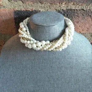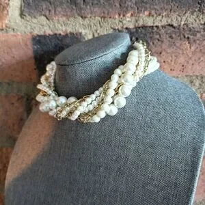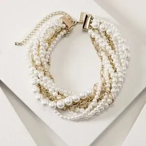 Say goodbye to your grandmother's pearls! This bib necklace features a chunky twist of gold tone links and faux pearls, giving the classic look a fresh, modern makeover. It's perfect for dressing up your tees or adding flair to your favorite outfit.