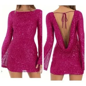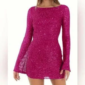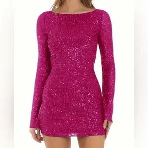 Keywords: bodycon dress, mini dress, pink dress, sequin dress, party dress, cocktail dress, glamorous, summer fashion, women's dress, long sleeve dress, boat neck dress, tie closure, evening wear, new condition.
