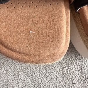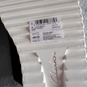 Brand new, never worn. Lana Beach Sandal by Clarks in Black Interest, a tonal black print with white detailing. Trendy comfort aesthetic, a versatile shoe for the season that can be worn everyday, on vacation or at the beach or pool. Slip-on double buckle-strap sandal with open front and back. Camo animal print fabric strap upper with chunky flatform platform sole, see video. Attached retail tag is sticker on bottom of one shoe, see photos. Note: light shelf/try-on wear with minor sticker residue at insole, see photos. Size 9.5, see photos for measurements.