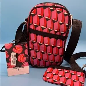 This chic crossbody bag from Diane Von Furstenberg showcases a bold pink and black design, perfect for making a statement. Its compact size and stylish pattern make it an ideal accessory for any modern wardrobe. Elevate your look with this eye-catching piece that combines fashion and functionality. Phone holder & card holder 8x4.5 & 4.5 x3