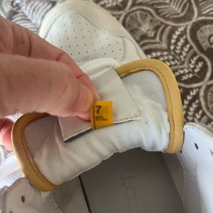 Excellent condition. Only worn twice. Mostly white, butter yellow at top, cream suede at toe and light blue sole.
