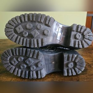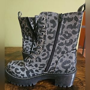 Brand new! Shimmer leopard print Platform combat boots Synthetic sole & upper Lace up and zip closures Round toe Fabric & synthetic fabric Padded footbed platform 2.25" heel Synthetic lug sole