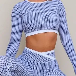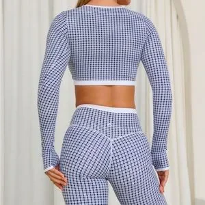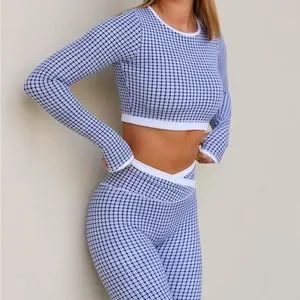 Stylish blue and white checkered activewear set from Astoria activewear. Includes long-sleeve crop top and leggings. Perfect for workouts or casual wear. Size small. Brand new with tags! So chic