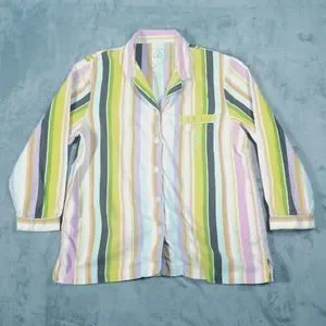 This Victoria's Secret pajama set is a colorful and cozy choice for women in size Large. Made of cotton flannel with a striped rainbow pattern, it features a collared neckline, long sleeves, and button closure. This Y2K-inspired set is machine washable and perfect for lounging in retro style during any season.