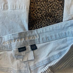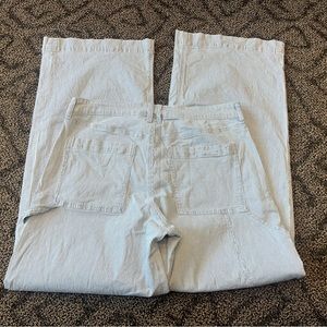 Like new American Eagle Super High-Rise Baggy Wide Leg blue white striped carpenter pants, size 12 long. Measurements are approximately 33” inseam, 11.5” rise, 16.5” across waist laying flat and 12” leg opening.