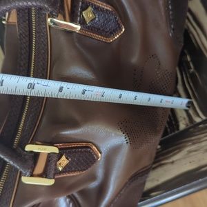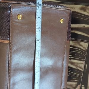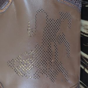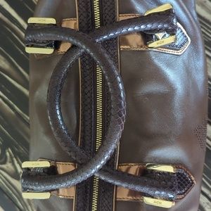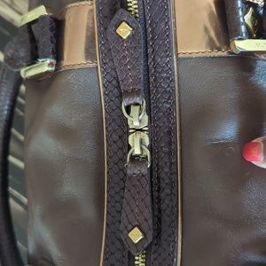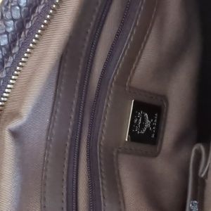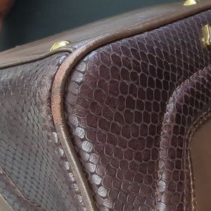 MGM like brown bag. It is leather with a lizard like design on the sizes and handles. Gold hardware, clean inside with a small spot, zipper that opens to both sides.