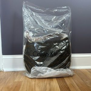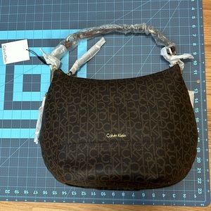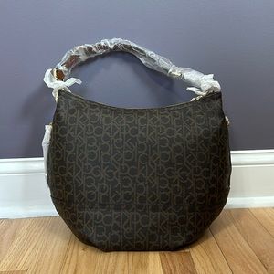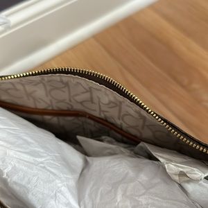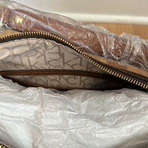 NWT Calvin Klein shoulder bag in brown. Both sides have a zipper pocket.