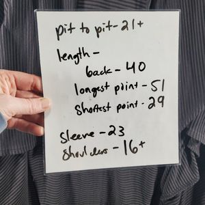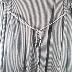 Size large Bryn Walker, flat measurements in photo #3. Open front shawl collar cardigan with tie back detail, stripes in black and warm grey, cotton/rayon/spandex blend, made in the USA. Light pilling, lightly worn condition, no stains or holes or flaws noted.
