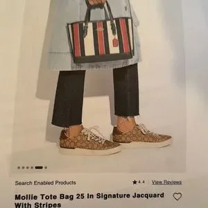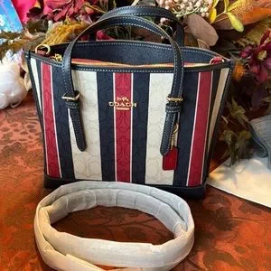 This is a Coach Mollie tot. I used once. There are no defects. Just like new. The Creed number is CB570. Has zippered compartment in center. Has detachable strap. The strap was never used. Stylish and versatile, this Coach bag features a striking multicolor striped design. Perfect for any occasion. The matching wallet is listed.