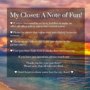 If you're interested in an item, feel free to make an offer; all offers will be taken into consideration. If you have any questions, please reach out. Thank you for your purchase! Don't forget to show some love for my closet! ♥
