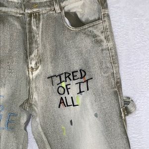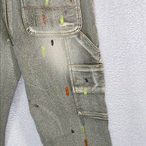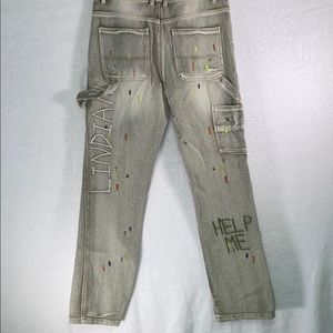 These tan straight-leg jeans boast a unique artistic flair with their distressed detailing and paint splatters, offering a vintage-inspired look.