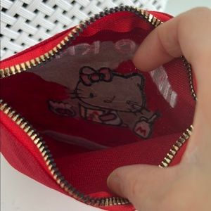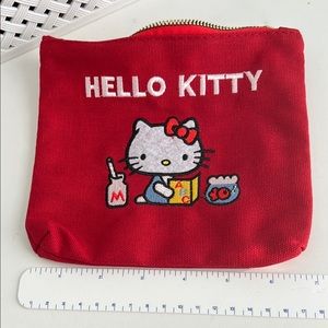 This charming Hello Kitty bag in vibrant red is perfect for carrying your essentials. Featuring a delightful Hello Kitty illustration with a red bow, it adds a playful touch to your accessory collection. Made from cotton fabric, its compact design is both stylish and functional. New.