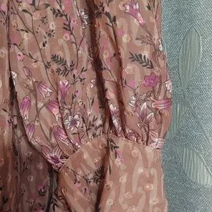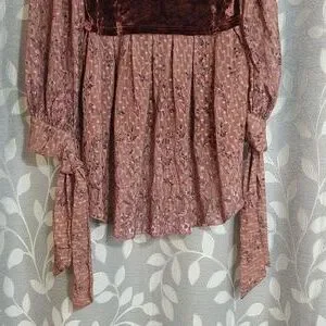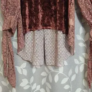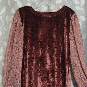 This elegant women's top features a luxurious velvet front and chiffon sleeves, perfect for adding a touch of sophistication to any outfit. The rich burgandy color complements the soft pink chiffon, creating a stylish and versatile piece.