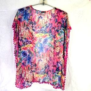 VENUS Brilliant Tropical sheer Duster Cover up Sz M Hot pink Pom Pom Trim