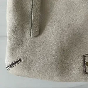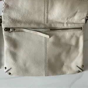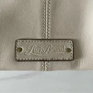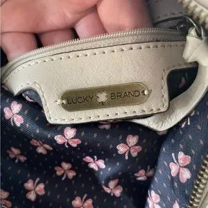This bag is so much fun! Crossbody design. Ivory color. Leather. Foldover top. Lucky branded lining. Lining is navy blue with pink four leaf clovers all over it. Removable leather tassel purse charm. Top of charm is gold with Lucky Brand logo. Pockets galore! Main compartment zippers closed. On both outer sides there is a zipper pocket. Inside there is both a zipper pocket and two open pockets. Only flaw is that there are markings on the outside fabric (pictured). In otherwise great shape. Perfect for Summer Festivals! Gives total boho vibes!