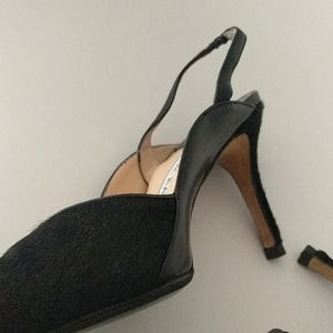 These Manolo Blahnik heels feature a black leather, a short slim kitten heel, a pointed toe, a sling back heel and a black faux fur accent down the side.