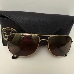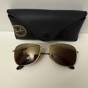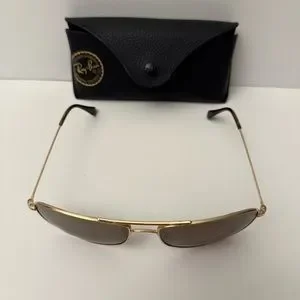 Stylish Ray-Ban sunglasses with gold frame. Brown lenses for a classic look. Comes with a black case.