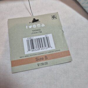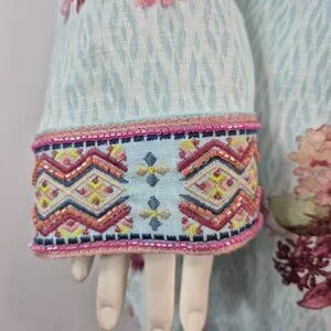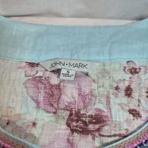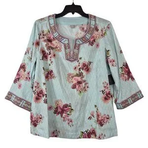 This is a women's floral print tunic blouse by John Mark in size S. It features a V-neck, 3/4 sleeves, beaded accents, and a relaxed fit. The blouse is in a blue color with pink embroidery. Made of 82% linen and 18% cotton, it is machine washable and suitable for all seasons. Ideal for travel, parties, or casual wear.