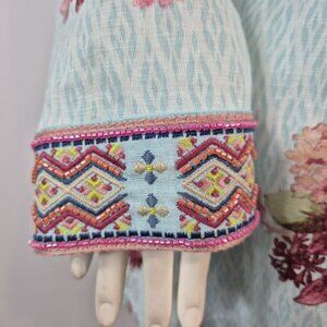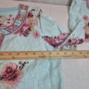 John Mark Women's Size S Floral Print Embroidered and Beaded Tunic Blue Pink 53