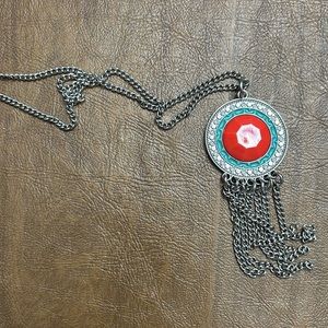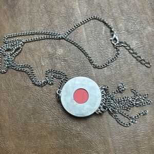 Elegant silver necklace featuring a pink-accented pendant. Perfect for adding a touch of color to any outfit.