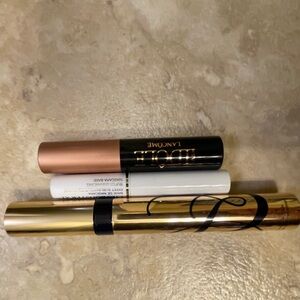 Lancome skincare set featuring creams and lotions. 1, Lancôme mascara and mascara base, Comes with a sleek black cosmetic bag.
