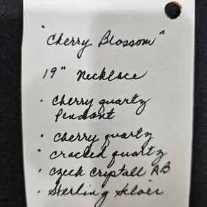 This 'Cherry Blossom' necklace is designed and handcrafted by me. The necklace features round cherry quartz beads, medium-sized clear cracked quartz nuggets and a lovely, carved, rose-shaped cherry quartz pendant, measuring 1 1/4" in diameter. The total pendant length from its sterling silver bail to bottom, is 1 6/8". The pendant's bail is centered with cherry quartz and sterling silver beads on each side. Cherry quartz beads with spacers of gleaming Czech crystal AB enhance the sterling silver lobster clasp on each side. All findings are sterling silver as well. The necklace measure 20" in length, including the lobster clasp. The soft colors and nuances of this one-of-a-kind jewelry piece are sure to remind its wearer of beautiful cherry blossoms in the spring.