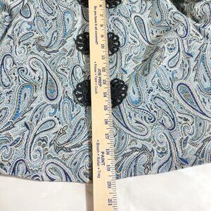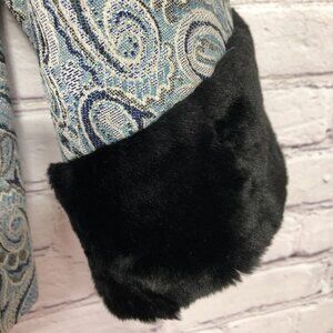 Elevate your style with this stunning Trina Turk Los Angeles Palm Springs Paisley Peacock Fur Cuff Jacket in size 10. The jacket features a beautiful paisley pattern in blue turquoise metallic with black accents and fur trim. The 3/4 sleeve jacket is made of fur, lined, collared, and lightweight, making it perfect for winter, fall, and spring seasons.