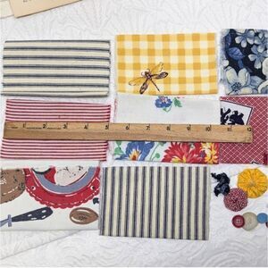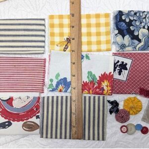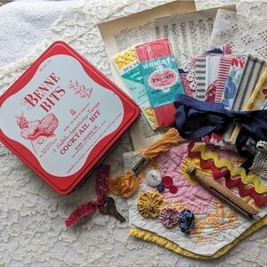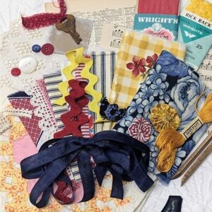 All Vintage Blues & Reds & Yellows, includes coordinating fabric pieces, Rick rack, bias tape, seam binding, embroidery thread, buttons, quilt piece, vintage music sheet and dictionary page, yoyos, rusty key, lace and crochet piece. All fits into the vintage Americana square tin, packaged with love.