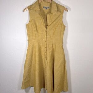 Pretty yellow dress from Sharagano in a mustard color. Size 9. Gold buttons up the front. Waist measurement is 14.5 inches across. Pit to pit measurement is 18 inches. Flattering A-line style with a full skirt. This is in excellent condition with no holes or stains.