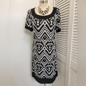 NWT. Elegant black and white dress featuring a striking geometric pattern. Perfect for any occasion. 95% polyester and 5% spandex. Size 16.*