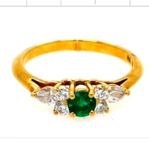 It showcases a vibrant 0.20ct round green emerald, known for its exceptional intensity and transparency,