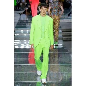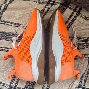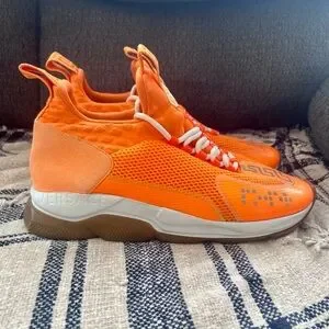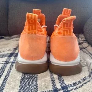Authentic Versace sneakers in a sleek sporty style. Chunky cross trainer style sneakers. Polyester and PVC upper in a neon orange with silver accents. Almond toe. Lace-up vamp. Greca woven pull-tabs at tongue and back collar. White mid-sole with Versace embossed on the side. Tan rubber chain shaped soles. Style DSR857G. Made in Italy. Great for around town, sure to get noticed.
