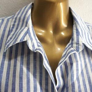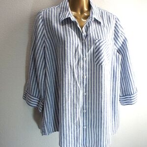 this is a chicos blouse.size 2. Luxe stripes and lovely linen? This shirt is a keeper. It's styled in a cooling, moisture-wicking (and wrinkle-free) fabrication, with a chest pocket and 3/4-sleeves. No-iron fabric gives you an always-pristine, wrinkle-free look. Button closure.Measurements are pit to pit 22.5". top to bottom 28".