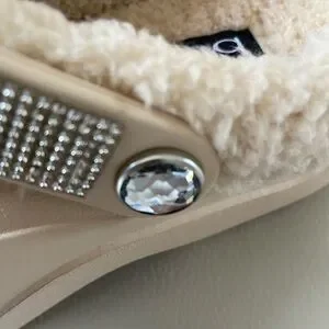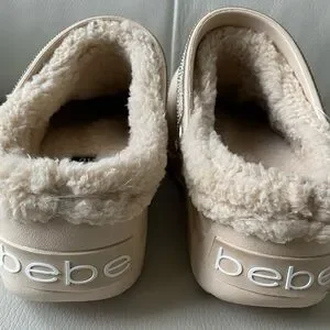 NWT- Step into comfort with these cute and fuzzy neutral color women's bebe Janessa slip on shoes accented with sparkly rhinestones