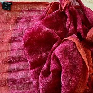 Eileen Fisher gorgeous lightweight wool scarf. It is a delicate weave that can be worn in many different ways including as a shawl. It is 23” X 70” the color is a rich burnt orange red.