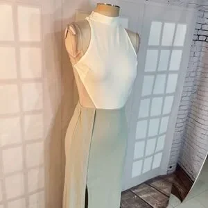 This elegant maxi dress features a white halter top with an open back and cutout sides, highlighting the shoulders. The long, slit skirt adds movement and drama, balancing boldness and classic style. Perfect for formal events or special occasions.